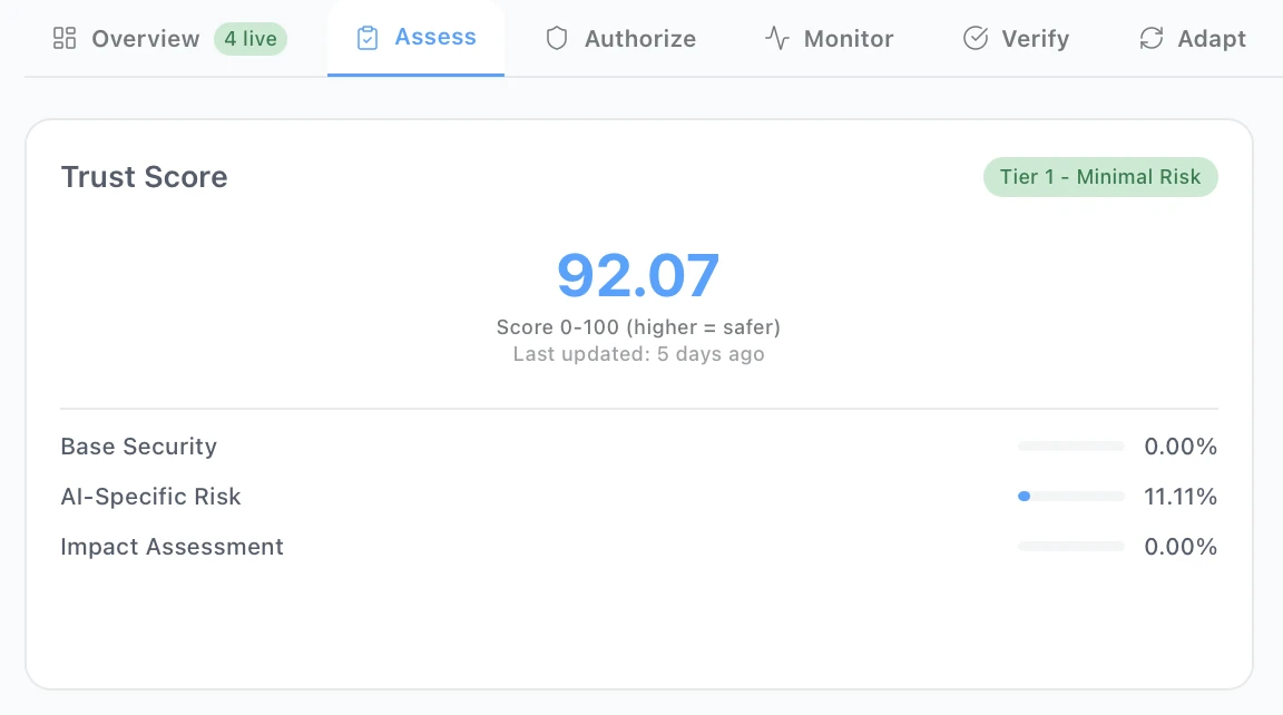 Trust Score card on the Assess tab, showing the score, tier badge, and component breakdown.